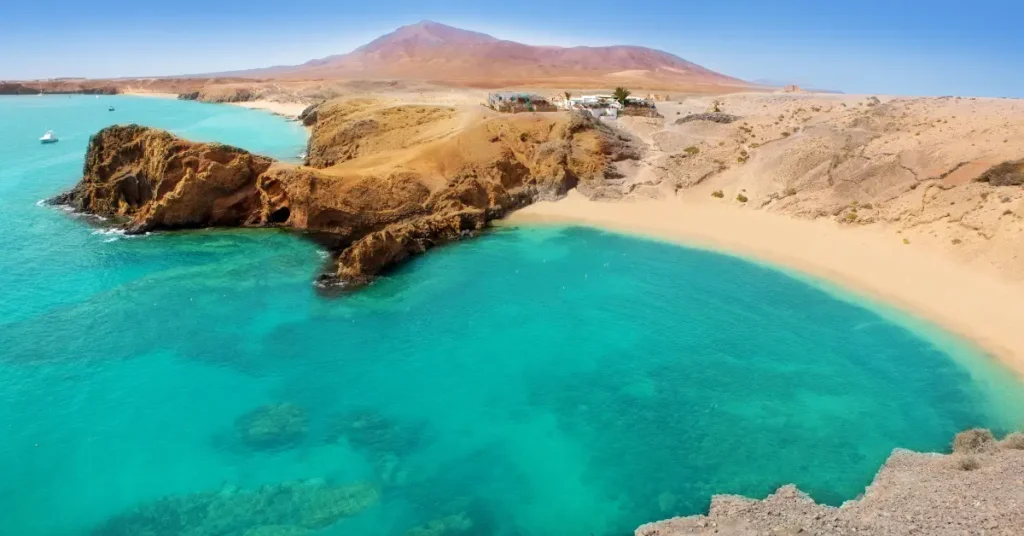 Tucked away in the southern tip of Lanzarote, Playa Papagayo is actually a series of five stunning coves separated by volcanic headlands, and it’s celebrated as one of the Best Beaches in Spain. The main beach features golden sand that contrasts beautifully with the turquoise water and the dark volcanic landscape of Timanfaya National Park in the distance.