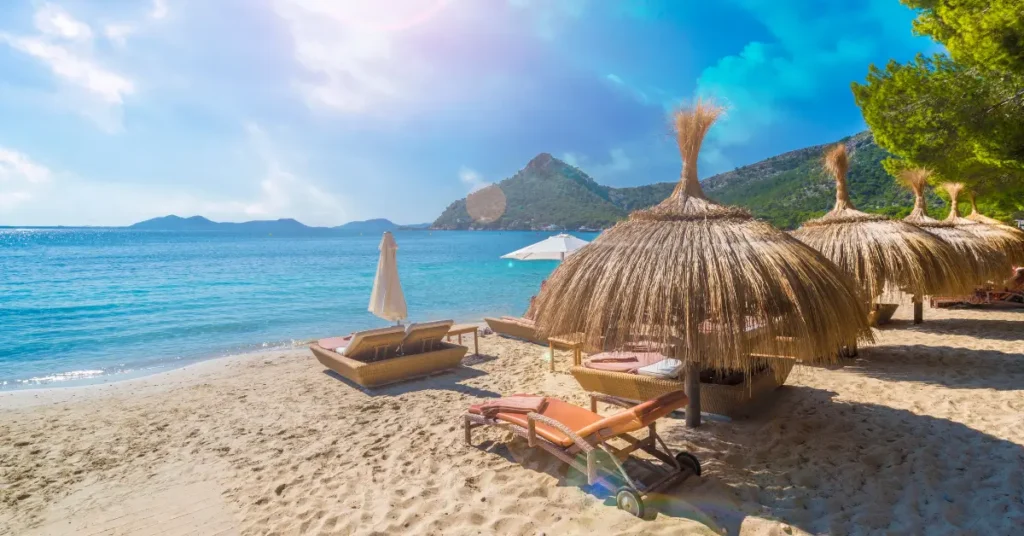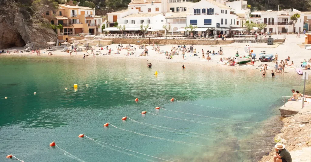 This pine-flanked ribbon of pale sand on Mallorca’s northern peninsula offers ideal conditions for families and stands out among the Best Beaches in Spain. The water shelves gently into crystal-clear depths, creating safe swimming conditions for children, while the surrounding pine trees provide natural shade during the hottest hours.